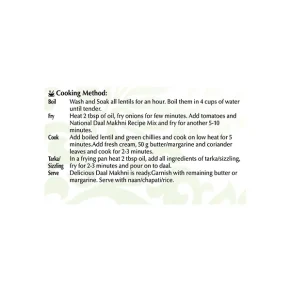 National Daal Makhni Recipe Mix is for lentil curry simmered in butter, specially made by a panel of experts. It is prepared aromatic spices and the finest ingredients in exactly the right measure, enabling you to cook delicious meals with ease.