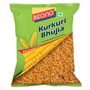 Namkeens indiens Kurkuri bhujia, snack indien prêt à déguster, vermicelles fins à base de pommes de terre et farine de maïs, délicieusement épicés et croustillants.n Vendu en paquet de 200g